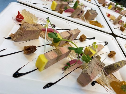 5 sortes de terrines de foie gras maison avec chutney, brioche et gelée de sauternes. Dressé sur assiette.