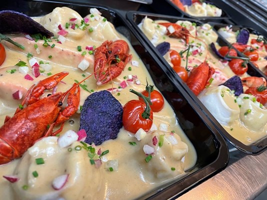 Duo de sole et saumon, tombée de poireaux, sauce homardine